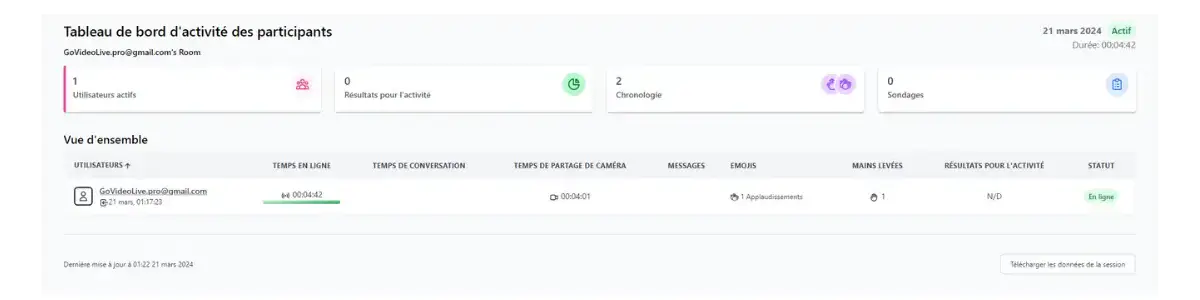Démarrez une salle/classe virtuelle avec de la vidéo, de l'audio, du partage d'écran, un chat et tous les outils nécessaires à une formation ou une réunion professionnelle.